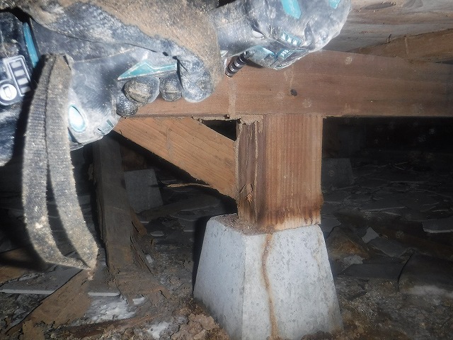 シロアリが侵入してきた経路や延伸食害の可能性がある部分にドリルで穴を空けて薬剤を注入していきます。