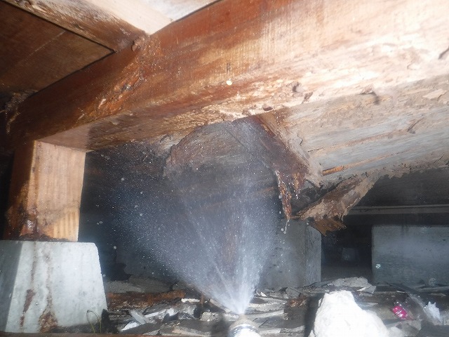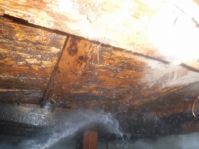 この和室は床組を改修工事で直す必要性があるため、新しい木材にも後日消毒をします。