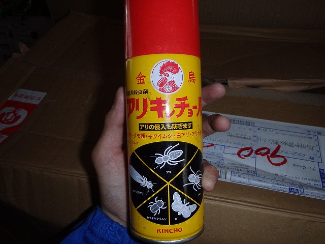 事務所の入り口付近に置いてあったダンボールをずらしたところ、アリの巣みたいなものがあったため殺虫剤をかなり振ったとのことでした。