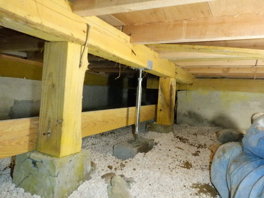 損傷した束石の横に補助材として鋼製束を設置、そもそもの原因である床下土壌面にベタ基礎(床下の土壌部分がコンクリート造りの構造)と同等まで引き上げる調湿材の石を敷設しました。