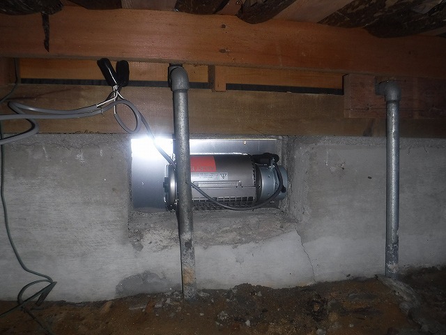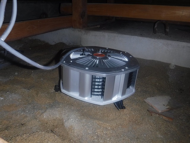 解決策としては、上記写真の下の撹拌機で空気をかき回して、写真上の床下換気扇の排出型で外に空気を引っ張ってあげるのが最適解かと判断します。