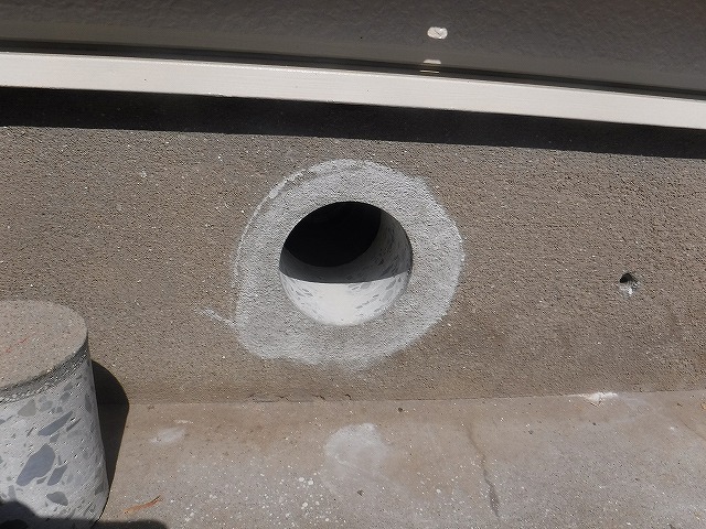 排気ダクトの先端に取り付けられた換気ノズルが、くり抜いた基礎部分にキチンと合わさる様に施工します。