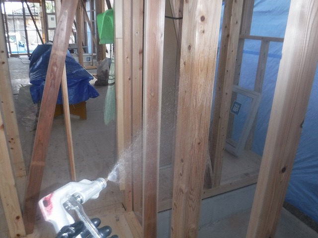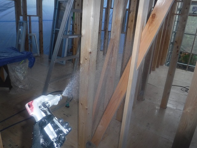 木部処理剤を用いて柱や間柱、筋交いなどの部材に床から1メートルを吹付処理します。