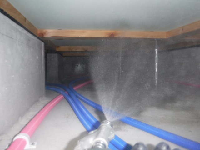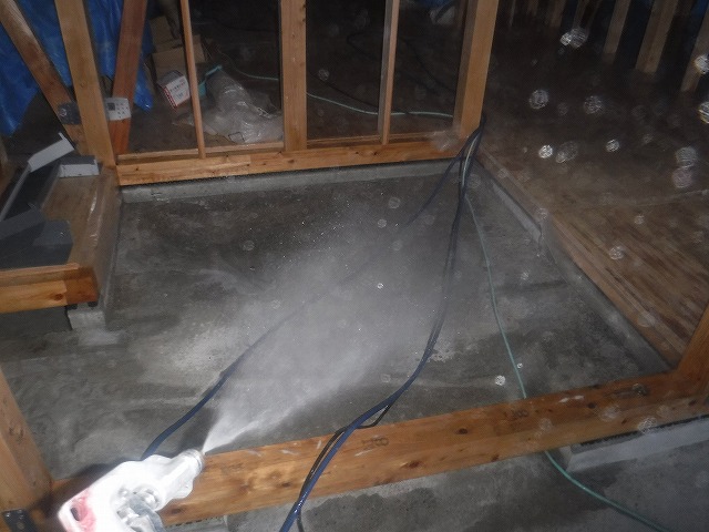 木部処理剤で土台、大引を吹付処理します。