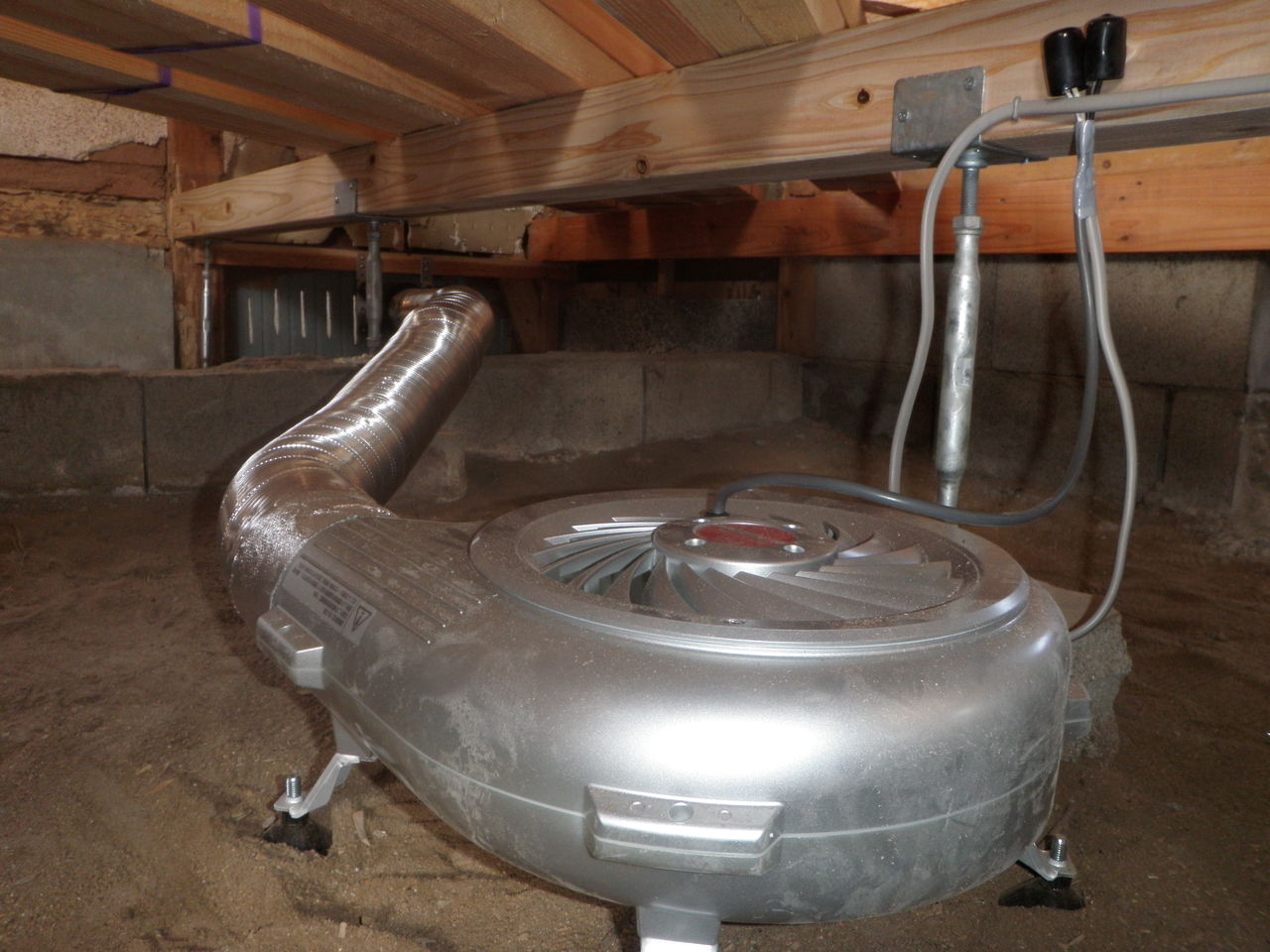 上記換気扇は床下換気扇の中でも最新型で特徴は、従来の換気扇は換気口ぐちに取り付け湿気を引っ張る事に対して、こちらの換気扇は、湿気の気になる床下に直接設置し湿気を吸い込みダクトを通じて換気工口に吐き出すといった非常に画期的な換気扇です。