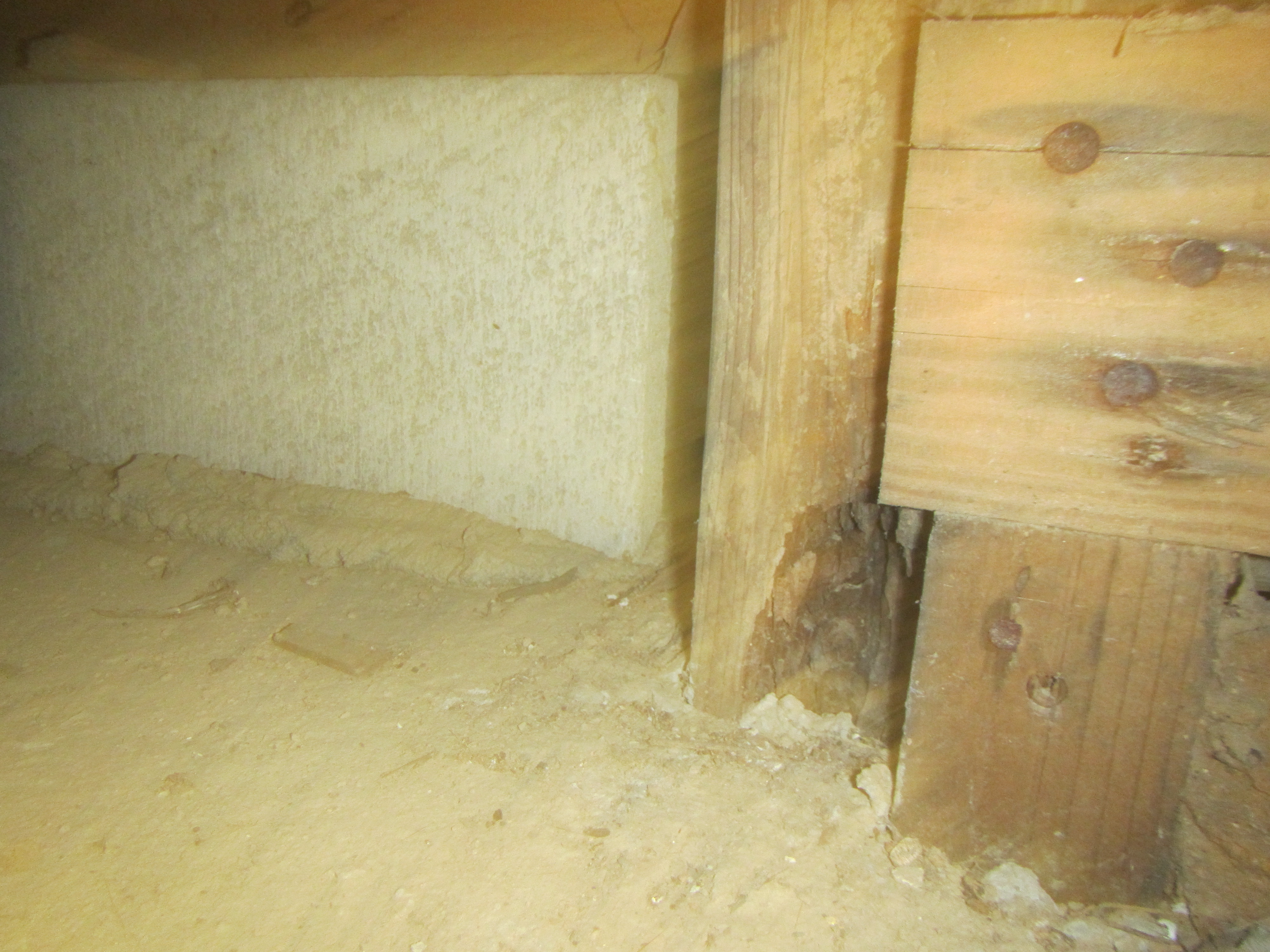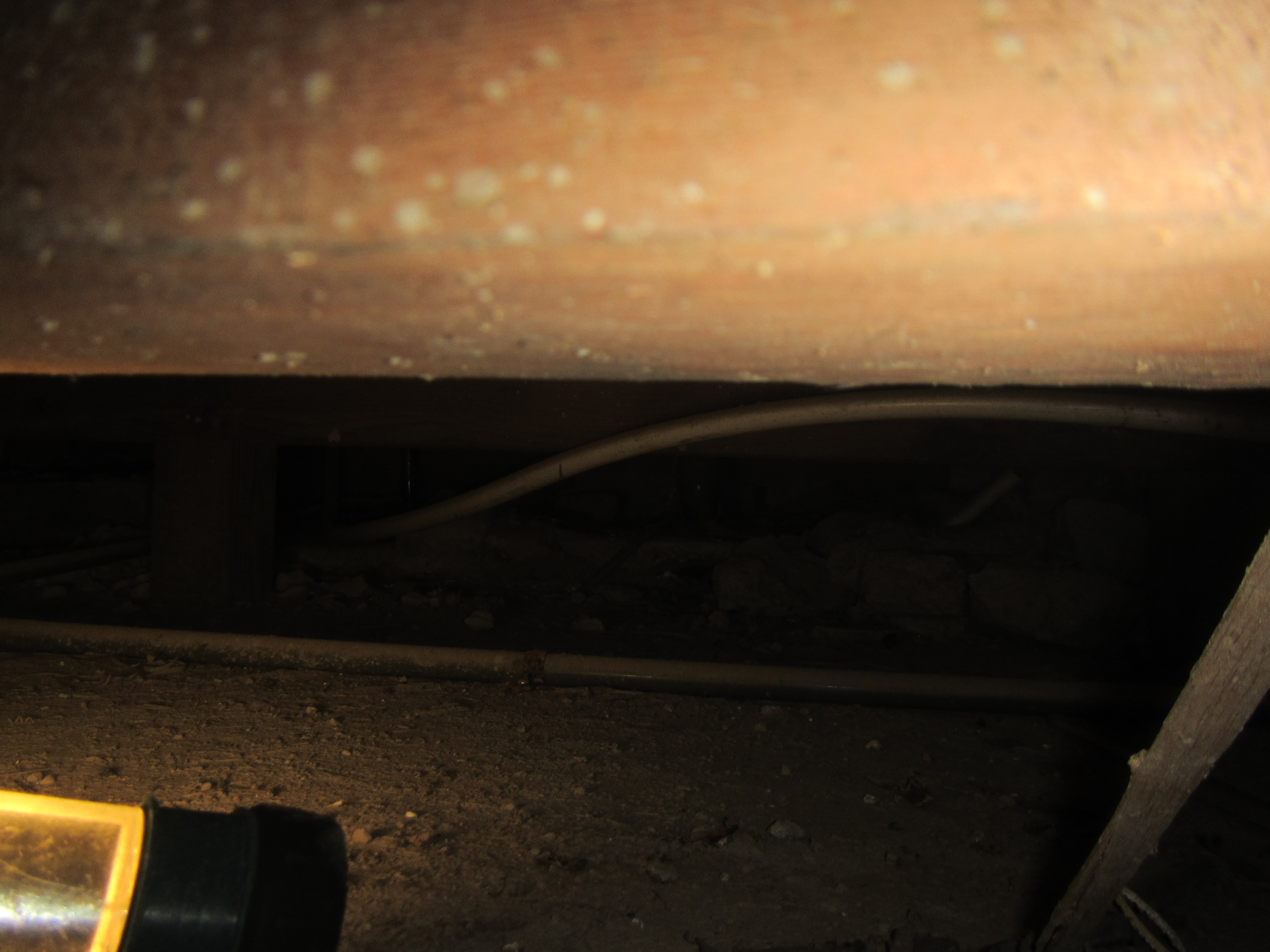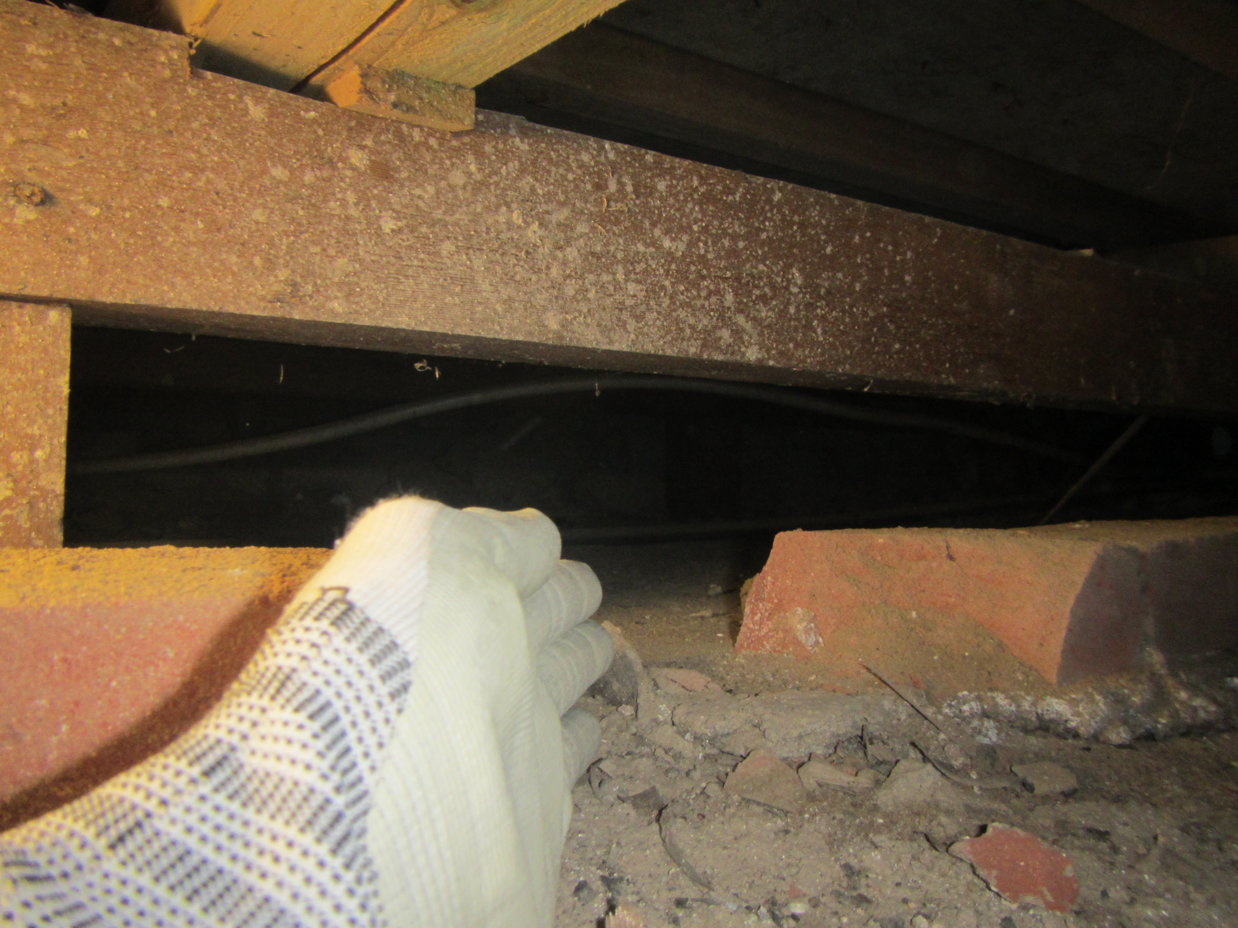 こちらのお家では、所々で木材の表面にカビが発生がみられました。カビの胞子が木材中に付着して発育できる環境にあるとカビは繁殖をしていきますが、木材腐朽菌とよばれる種類のカビの菌が付着して繁殖すると木材中の成分を著しく分解していきます。このような床下環境でのシロアリ予防施工では防蟻処理後の木材を考えた施工に気を配らなければなりません。