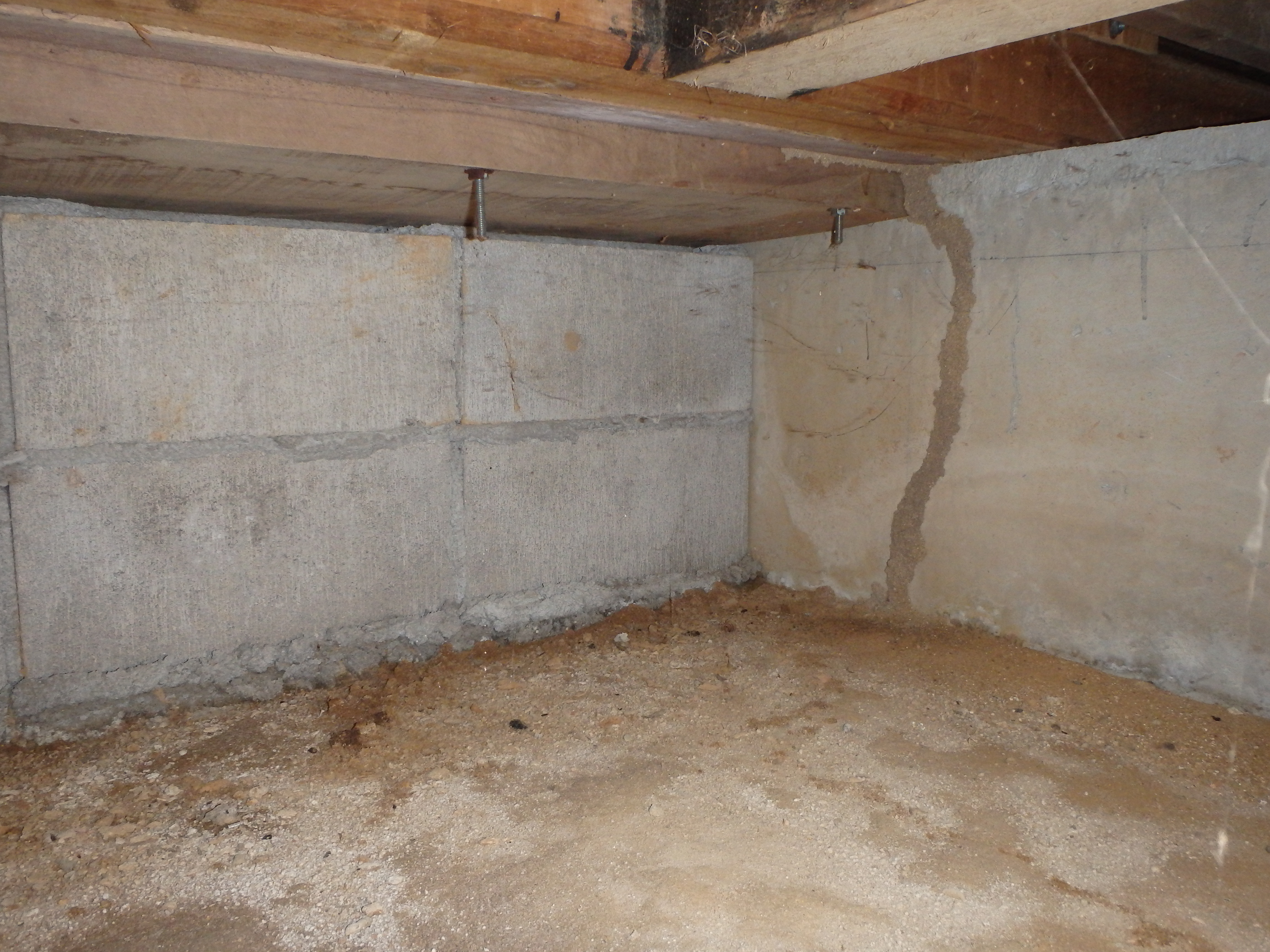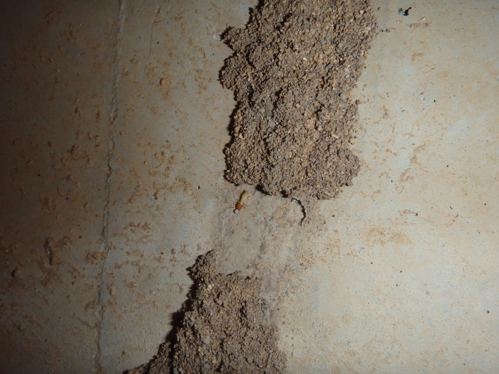 こちらは玄関前の床下です。右の内基礎に茶色線のようになっているものがわかりますか?蟻道(ギドウ)と呼ばれるシロアリの通り道です。