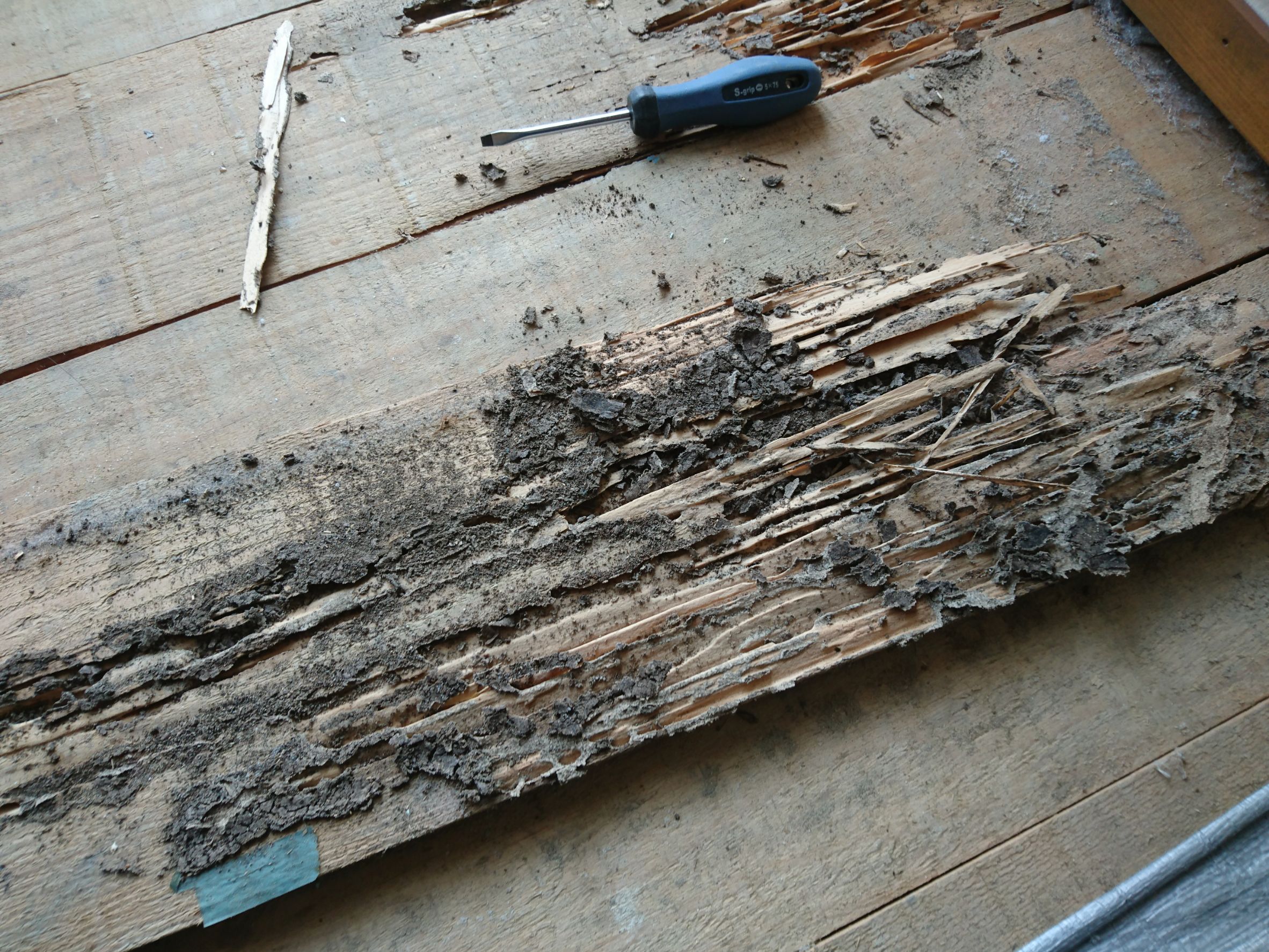 二階の床には木材が使用されており、シロアリによる食害がかなり進行していました。