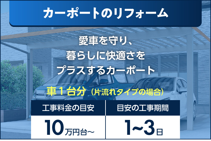 一般的なカーポートであれば、基礎工事を含めて1〜3日ほどで完了します。