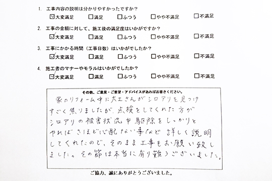 Y様この度は、誠にありがとうございます。リフォーム中のシロアリの発見は、当社でもよく遭遇するケースです。しかし、シロアリの被害が深刻な状態でなかったことが幸いだったと担当者一同、安心しております。今後とも末永いお付き合いをお願い申し上げます。