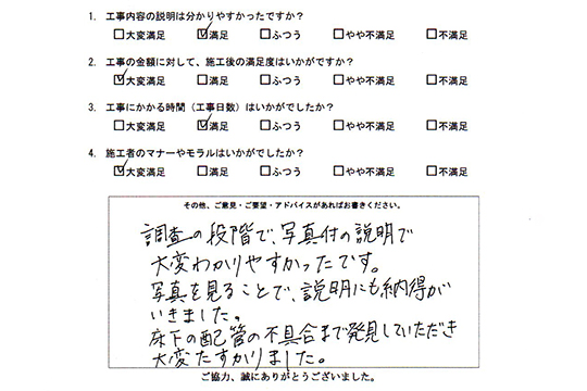 床下の配管の不具合まで発見していただき大変たすかりました。