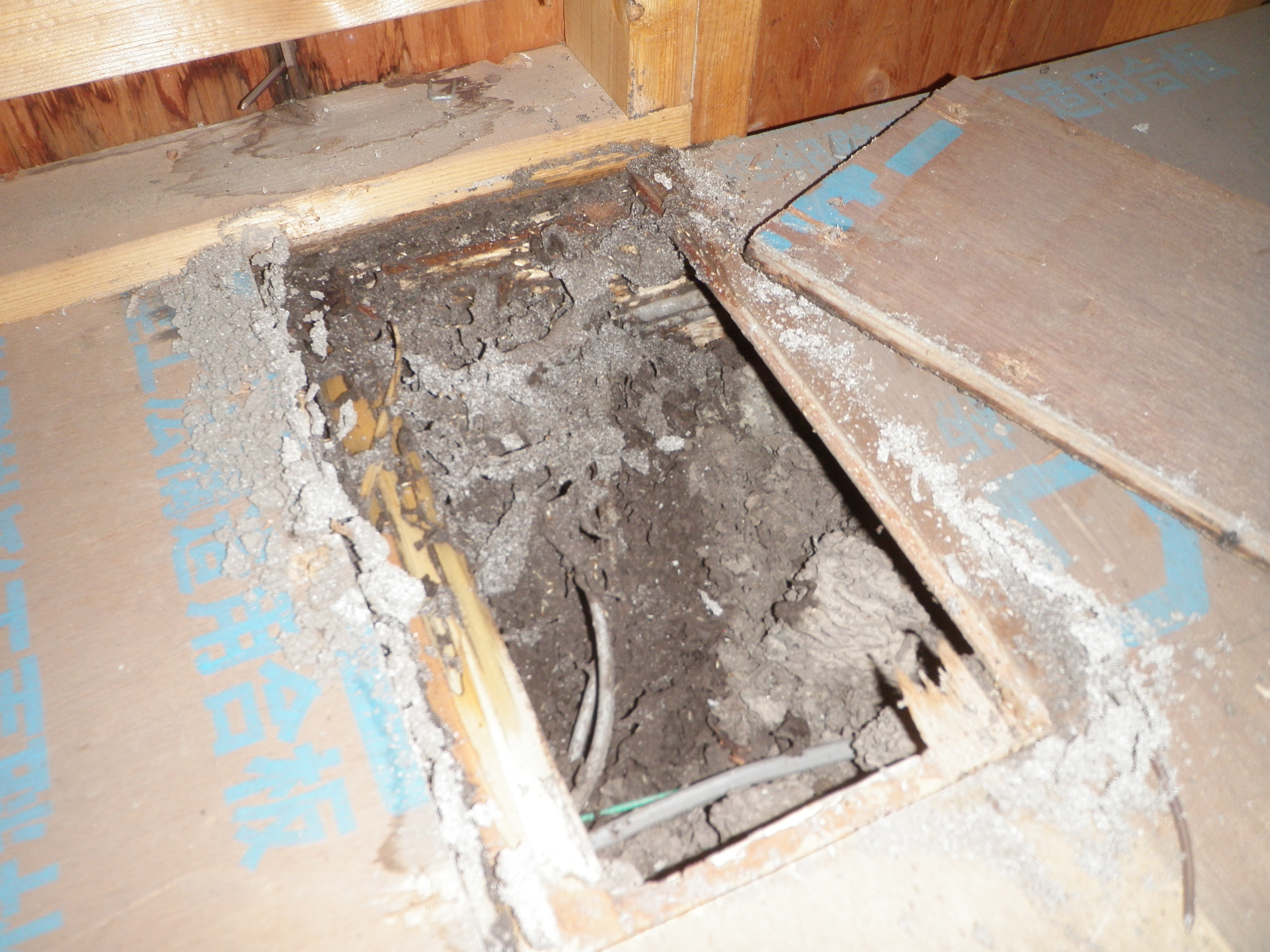 会社の電気がつかなくなり、電気屋さんに調べてもらったところ天井裏の電気配線がシロアリにかじられてしまっていたとのことです。