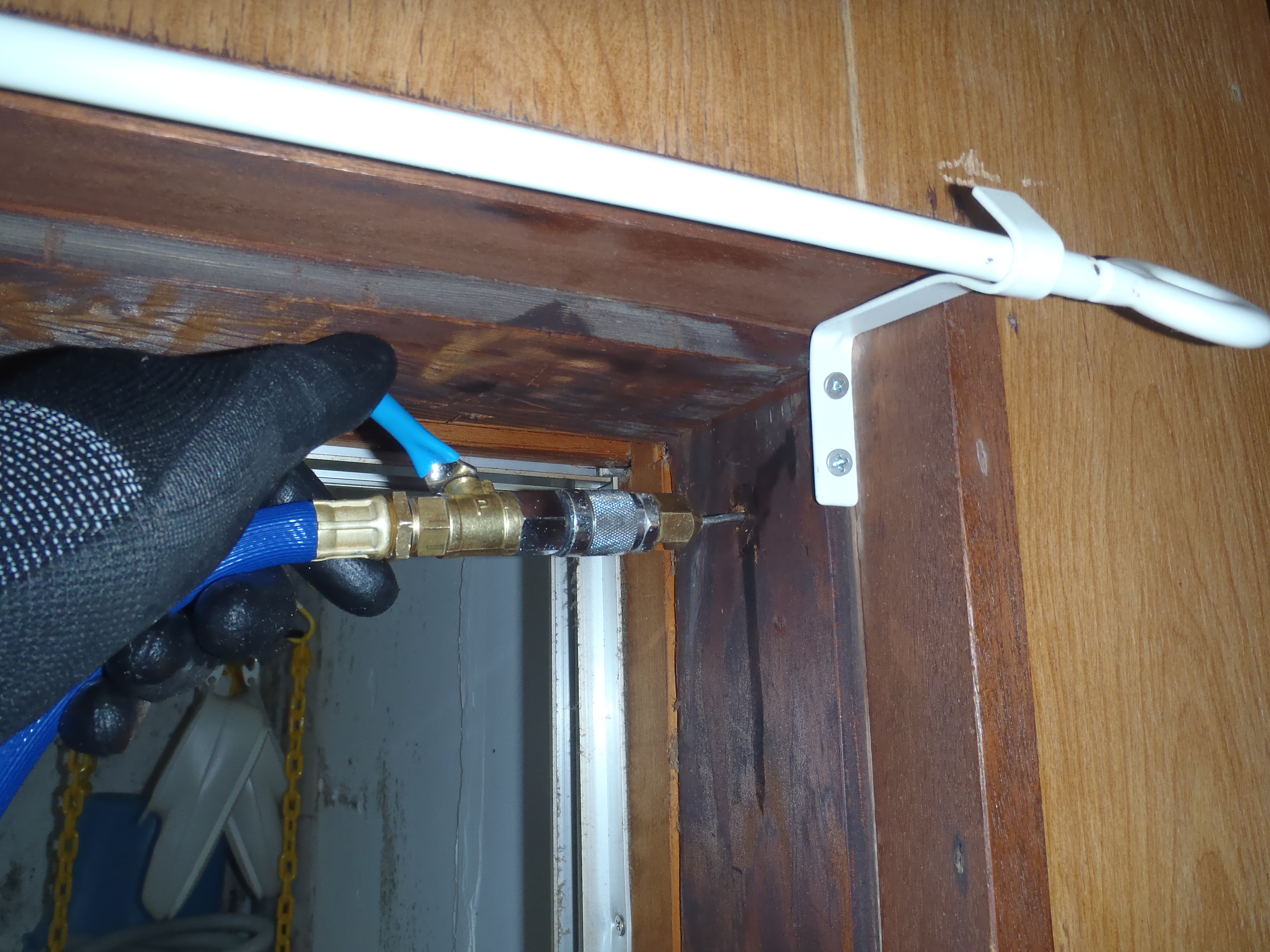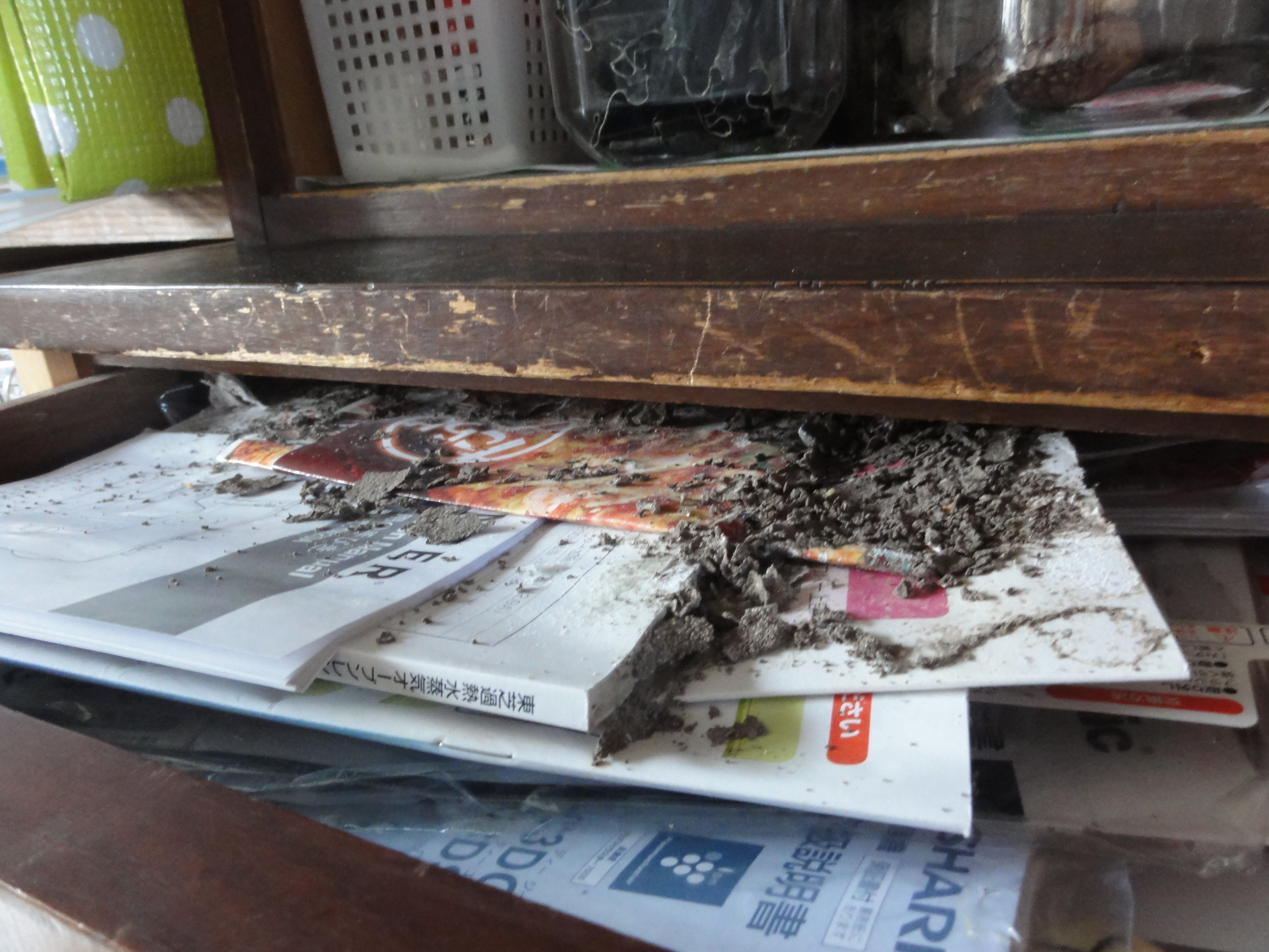 こちら食器棚の下に説明書などを入れており、長い間開けていなかったようです。久しぶりに戸棚を開けてみると土があって、よく見てみると白いウジのような虫がいて驚いて殺虫剤を撒かれたそうです。こちらのお客様宅はRC造りで床下のない建物でした。通常はシロアリが建物に入ってくる床下に入って施工を行いますが、床下がないため見えがかりへの薬剤注入と散布を行いました。